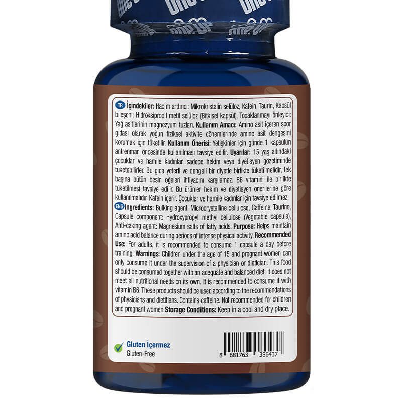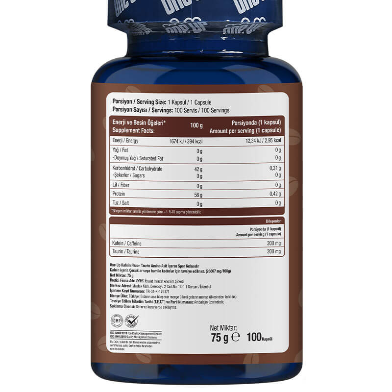 One Up Kafein Plus, her servisinde 200 mg kafein ve 200 mg taurin sunan bir gıda takviyesidir.